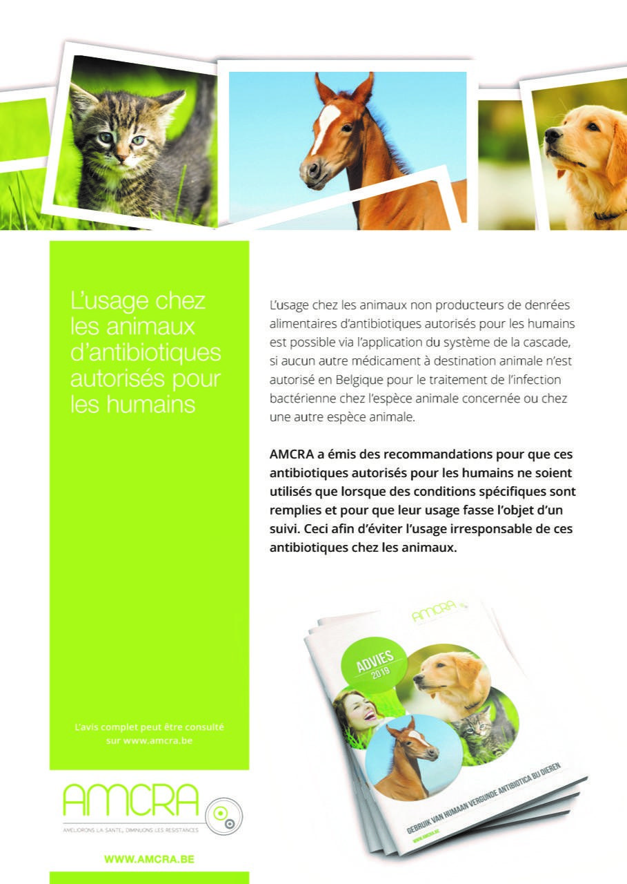 L’AMCRA a publié un avis formulant des recommandations précises sur l'utilisation d'antimicrobiens à usage humain chez les animaux. L'objectif est de limiter les recours non justifiés aux antibiotiques autorisés pour les humains en fixant les conditions exceptionnelles dans lesquelles leur usage est permis. L’avis contient également des recommandations spécifiques relatives à l’enregistrement et au contrôle de l’usage de ces antibiotiques.