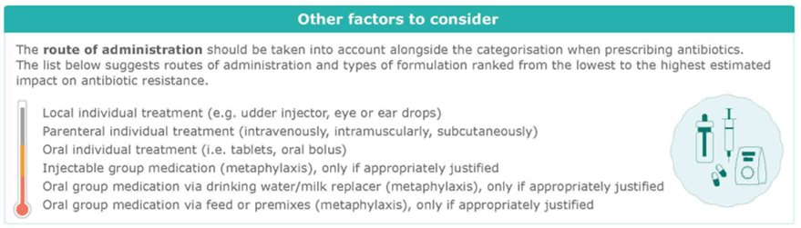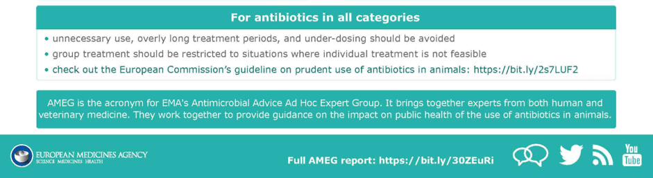Les nouvelles catégories sont le fruit de la collaboration de différents groupes d’experts en médecine vétérinaire et en médecine humaine. L’Agence européenne du Médicament (EMA) demande aux vétérinaires d’utiliser cette classification comme un fil conducteur pour assurer des choix responsables. Cette catégorisation ne représente pas une directive impérative, étant donné qu’il faut toujours tenir compte dans les choix thérapeutiques des informations mentionnées sur les notices des produits autorisés.