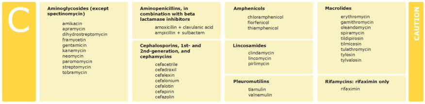 De manière générale, ces antibiotiques ne peuvent être utilisés que chez les animaux pour lesquels aucune alternative dans la catégorie D n’est efficace cliniquement.Se trouvent entre autres dans la catégorie C des aminoglycosides (à l’exception de la spectinomycine qui est en catégorie D), des aminopénicillines en combinaison avec un inhibiteur bêta-lactamase (par exemple l’amoxicilline + l’acide clavulanique), des macrolides, des lincosamides, du florfénicol.