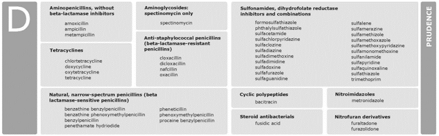 Les antibiotiques de la catégorie D « Prudence » peuvent être utilisés comme substances de 1ère ligne, mais comme toujours, uniquement si nécessaire. On y trouve les sulfamides, triméthoprime, spectinomycine, pénicillines à spectre étroit, métronidazole, aminopénicillines sans inhibiteur de bêta-lactamase…