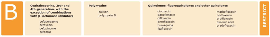 La catégorie « Restrict » reprend les antibiotiques d'importance critique les plus prioritaires pour l’être humain. Il s’agit des 3e et 4e générations de céphalosporines, des quinolones et des polymyxines, avec la colistine et la polymyxine B. Leur utilisation chez les animaux doit donc être limitée aux cas où les antibiotiques de catégories inférieures ne sont plus efficaces. Leur usage se basera donc idéalement sur les résultats d’un test de sensibilité.