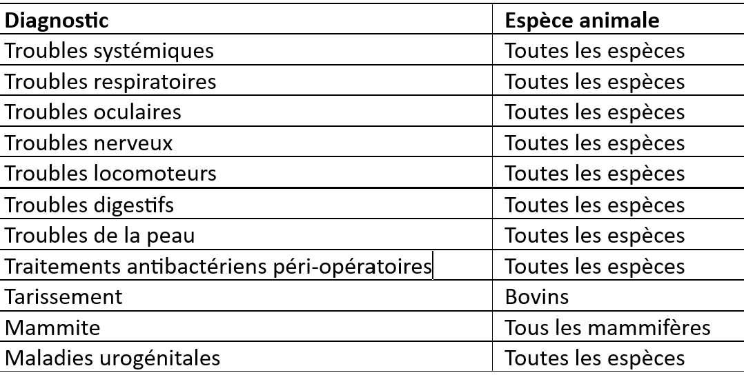 Le vétérinaire choisit parmi les 11 indications prédéfinies énumérées dans le tableau ci-dessous.