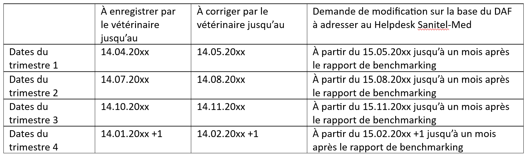 À partir du 1e janvier 2026, le vétérinaire pourra apporter des modifications dans les enregistrements jusqu’au 14e jour du deuxième mois qui suit le trimestre. Ensuite, le vétérinaire ne pourra plus apporter d’adaptations lui-même, mais devra les signaler au Helpdesk Sanitel-Med. La demande au Helpdesk Sanitel-Med peut également s’effectuer via le helpdesk du système d’enregistrement dont le vétérinaire fait usage, tel que AB Register, Bigame, ou SGS. La demande de rectification doit être motivée au moyen du DAF. Les modifications de ce genre doivent être signalées le plus rapidement possible.