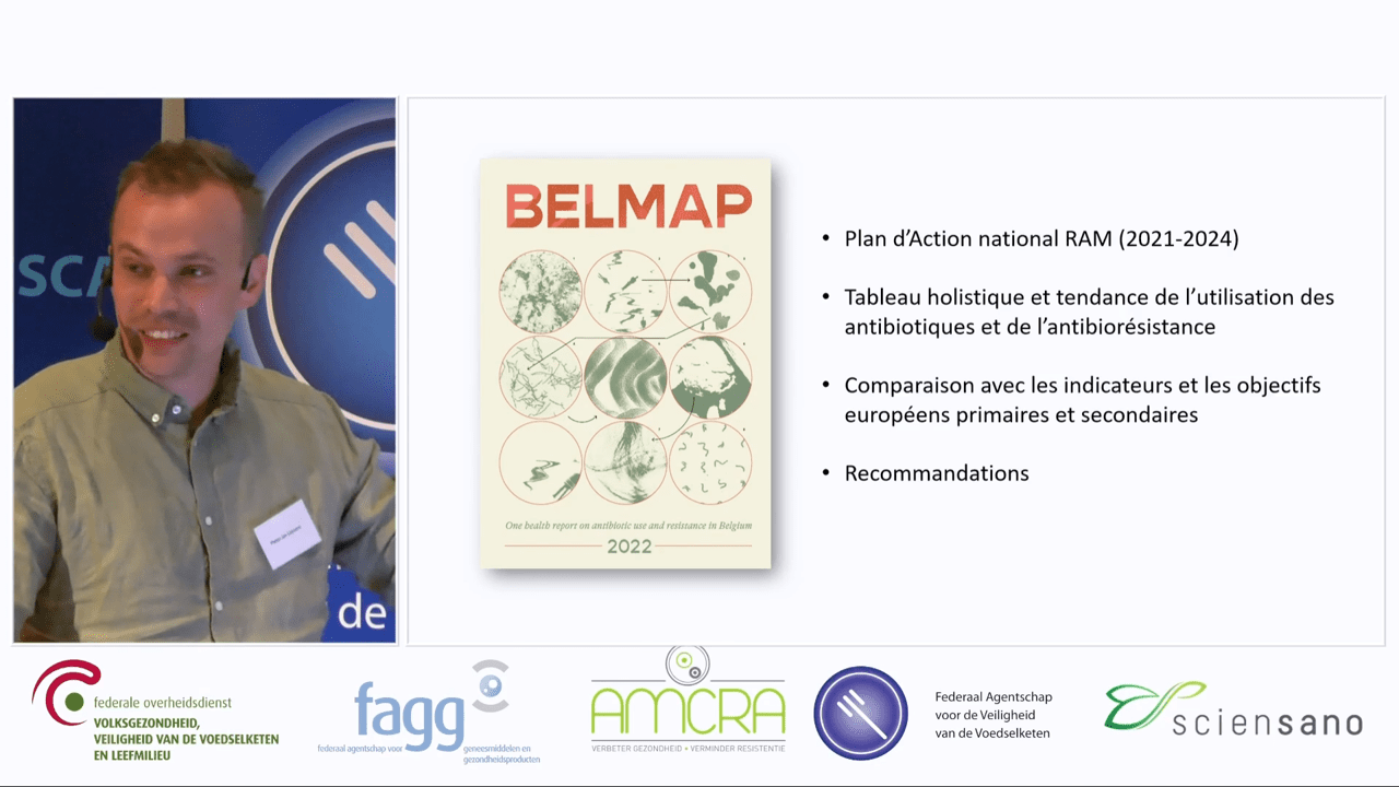 De namiddag ging van start met een inleiding over de doelstellingen en realisaties van het antibioticumconvenant 2021-2024. Aansluitend werden de antibioticumverkoopcijfers voor gebruik bij alle dieren in België in 2022 meegedeeld. Ook diersoortspecifieke gegevens werden getoond voor de sectoren varken, vleeskalveren en pluimvee (vleeskippen en leghennen). Alle resultaten gerelateerd aan antibioticumverkoop- en gebruiksgegevens zijn gepubliceerd in het BelVet-SAC rapport 2022.