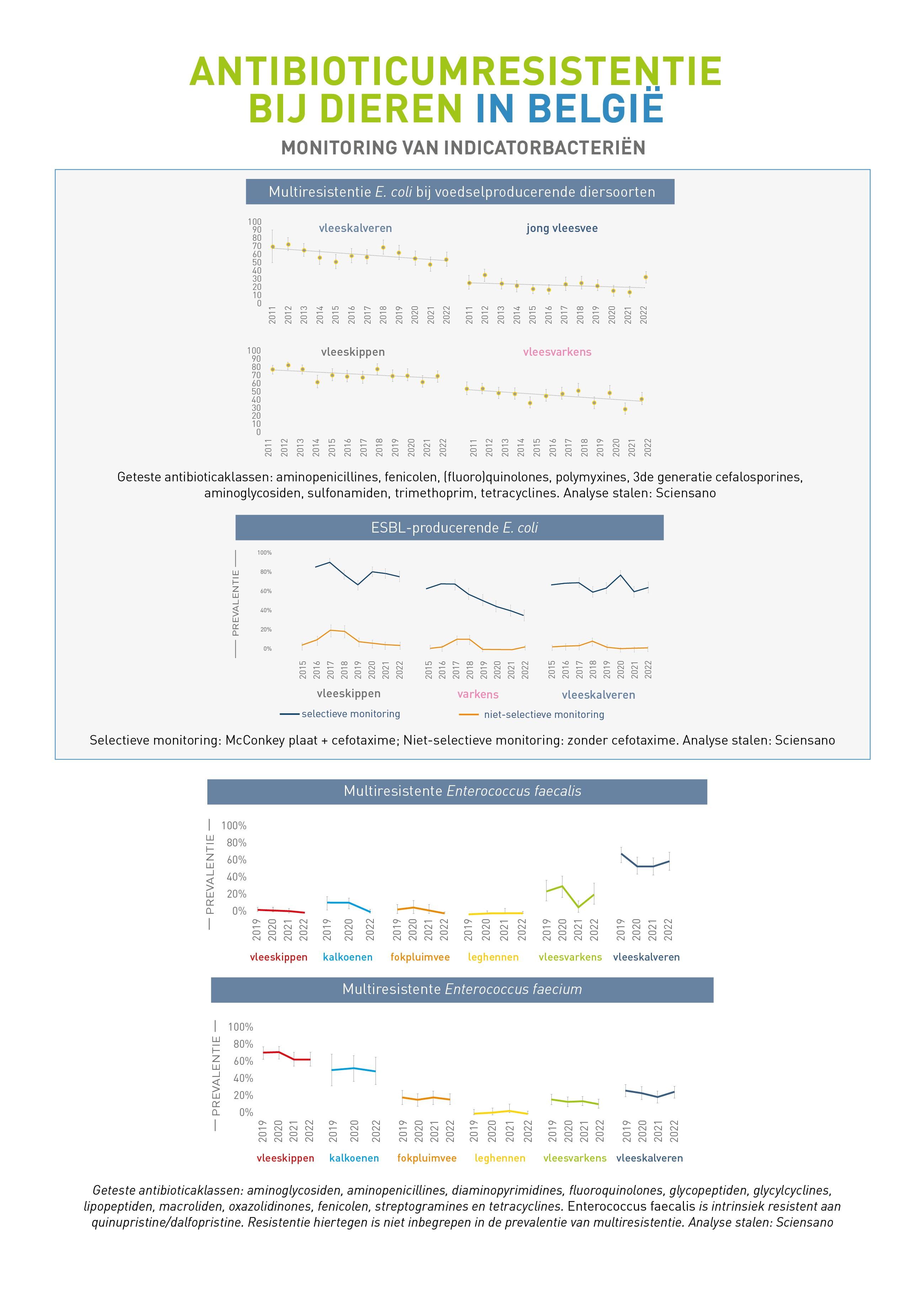 - Trendanalyse en sleutelresultaten van de monitoring van resistentie tegen antibiotica bij indicatorbacteriën E. coli en Enterococcen bij voedselproducerende dieren in België (Dr. Mickaël Cargnel en Carole Kowalewicz, Sciensano)
