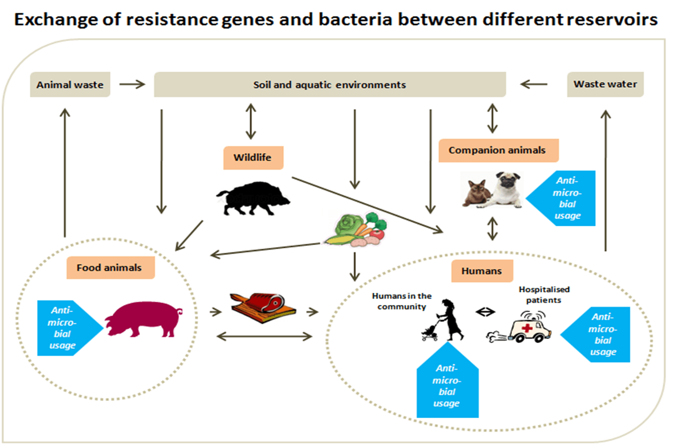 Het gebruik van antibiotica bij dier of mens veroorzaakt dus in de eerste plaats een selectiedruk op resistente bacteriën aanwezig bij dier of mens. Maar door transmissie kan resistentie overgedragen worden tussen dier en mens.