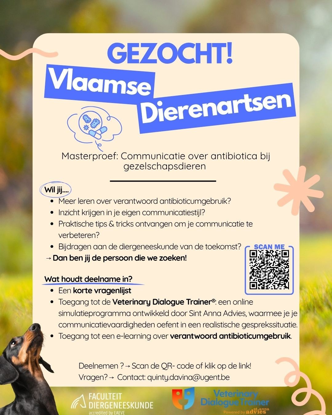 Hoe bespreekt u verantwoord antibioticagebruik effectief met eigenaren? Voor een masterproef aan de UGent worden Vlaamse dierenartsen gezocht die hun communicatievaardigheden willen aanscherpen. Wat levert het u op? Door deel te nemen krijgt u gratis toegang tot: • Veterinary Dialogue Trainer®: Oefen realistische gesprekken via een online simulatie. • E-learning: Verdiep uw kennis over verantwoord antibioticagebruik. • Directe feedback: Krijg inzicht in uw eigen communicatiestijl en praktische tips.