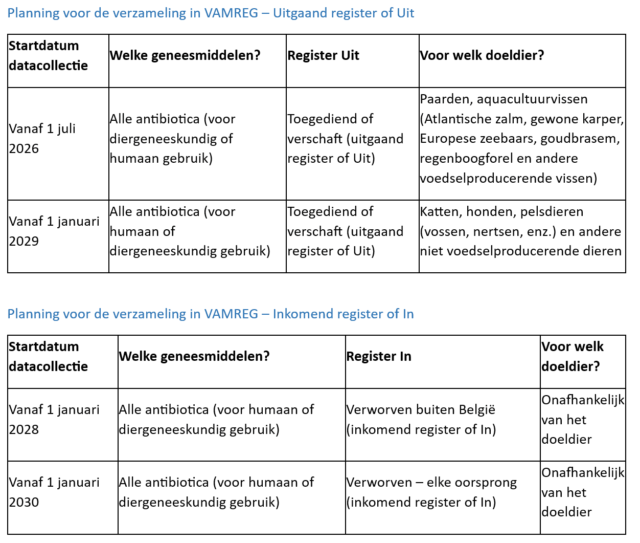 De verplichting om gegevens te registreren over het gebruik van antibiotica voor paarden en aquacultuurvissen in België gaat in op 1 juli 2026. Het gaat om antibiotica voor diergeneeskundig of menselijk gebruik die worden voorgeschreven, verschaft of toegediend voor paarden (al dan niet voedselproducerend) en aquacultuurvissen (Atlantische zalm, karper, Europese zeebaars, goudbrasem, regenboogforel en andere vissen die zijn bestemd voor voedselproductie). De registratie van deze gegevens gebeurt via VAMREG door dierenartsen die houder zijn van een diergeneeskundig depot en apotheker-titularissen van een voor het publiek opengestelde apotheek. Data over antibioticagebruik bij de voedselproducerende diersoorten runderen, varkens, vleeskalveren, konijnen, kleine herkauwers en pluimvee moeten nog steeds worden geregistreerd in Sanitel-Med.