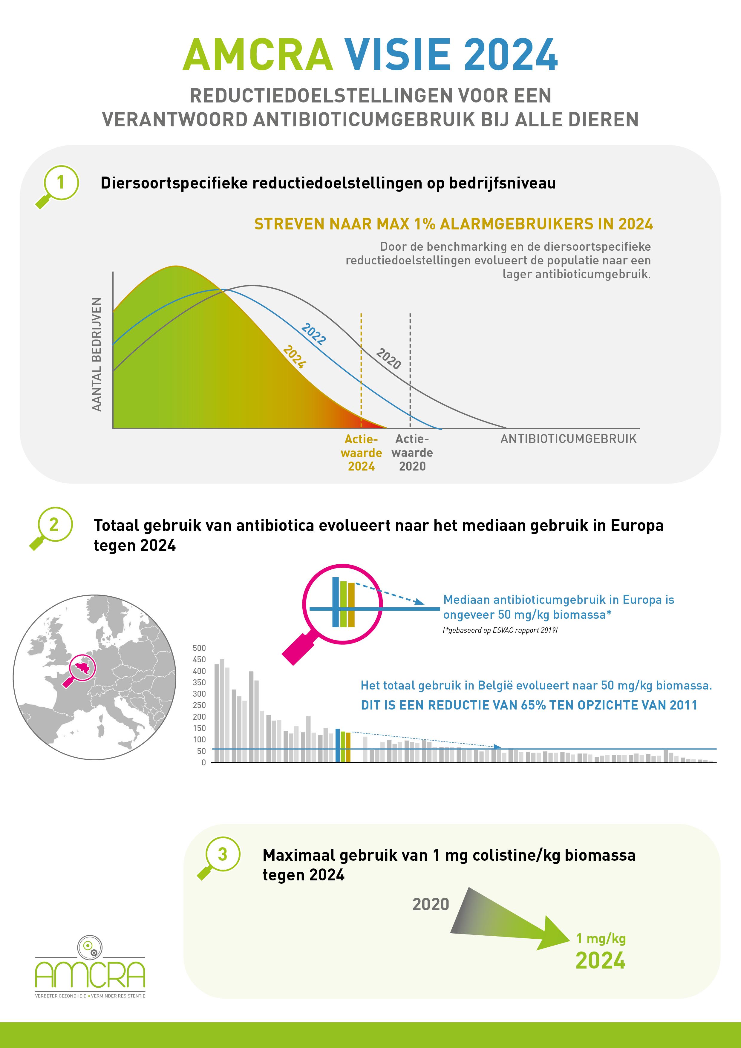 In de AMCRA 2024 worden de strategische doelstellingen met betrekking tot het antibioticumgebruik en resistentiebeleid bij dieren in België tussen 2021 en 2024 beschreven.
