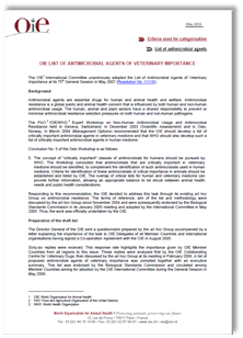 L’Office International des Épizooties (OIE), l’organisation mondiale pour la santé animale, a également classé les antibiotiques vétérinaires afin de garantir leur efficacité et leur disponibilité lorsqu’aucune alternative antibactérienne n’est disponible, ou seulement de manière limitée. Ce classement doit aussi guider les vétérinaires dans leur choix thérapeutique.