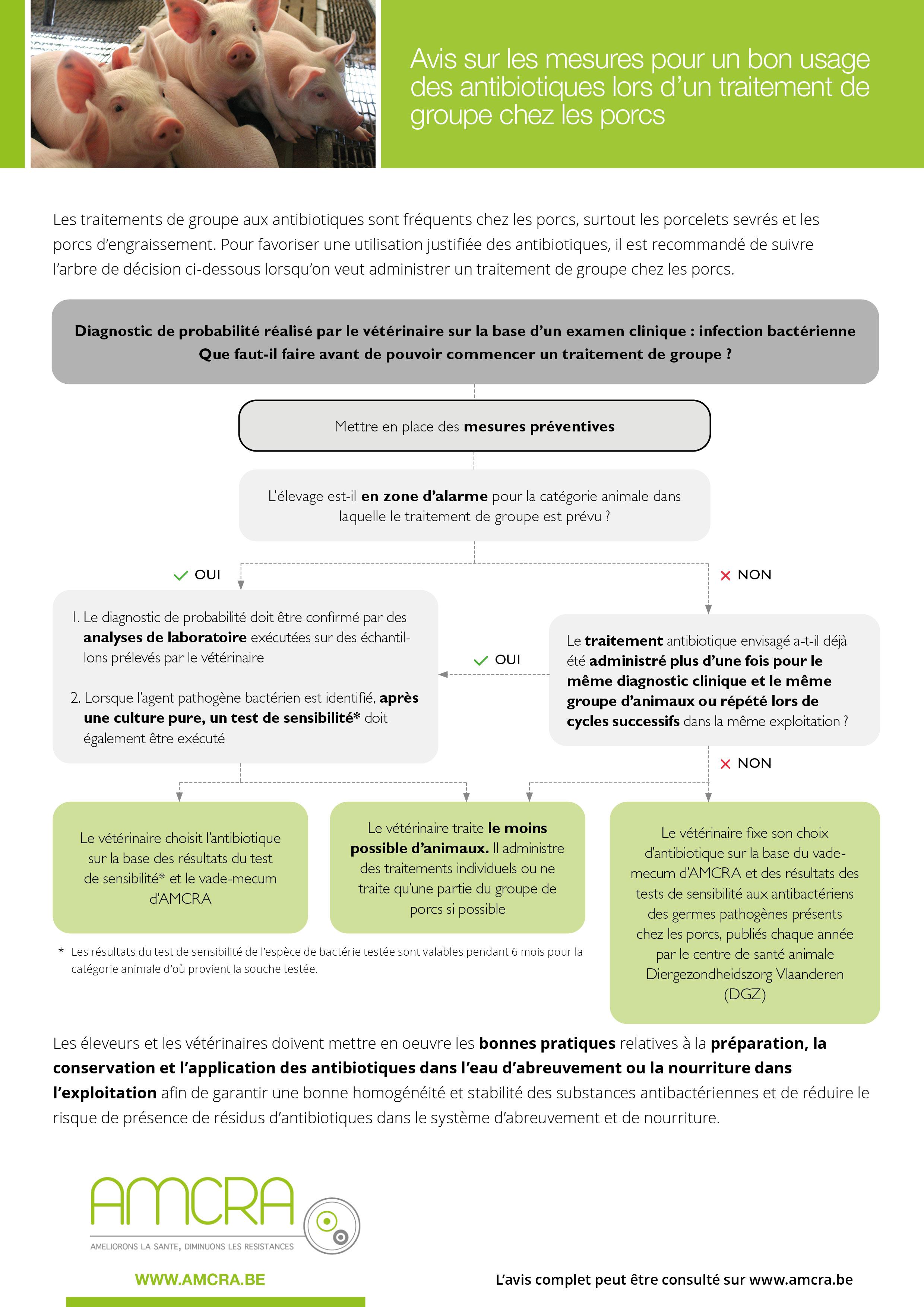 Des traitements de groupe avec des antibiotiques sont fréquemment administrés chez les porcs, principalement chez les porcelets sevrés et les porcs d’engraissement. Le secteur porcin s’est par ailleurs engagé, avec le choix d’objectifs de réduction qui lui sont propres, à poursuivre la diminution de son utilisation d’antibiotiques. Un groupe de travail d’AMCRA a également réfléchi aux mesures favorisant une diminution de l’utilisation d’antibiotiques chez les groupes d’animaux. L'avis inclut des mesures pour un bon usage des antibiotiques lors d'un traitement de groupe des porcs.