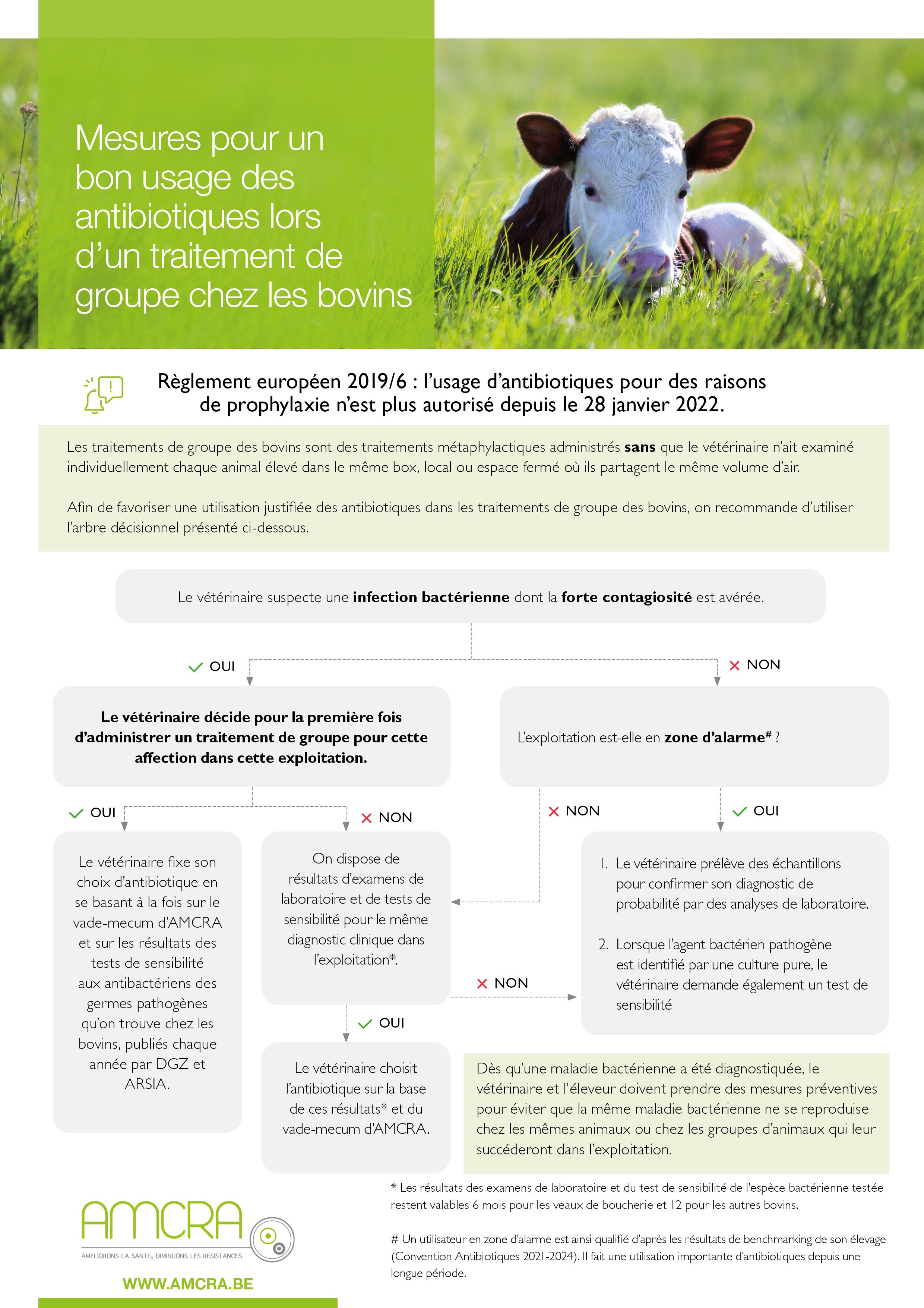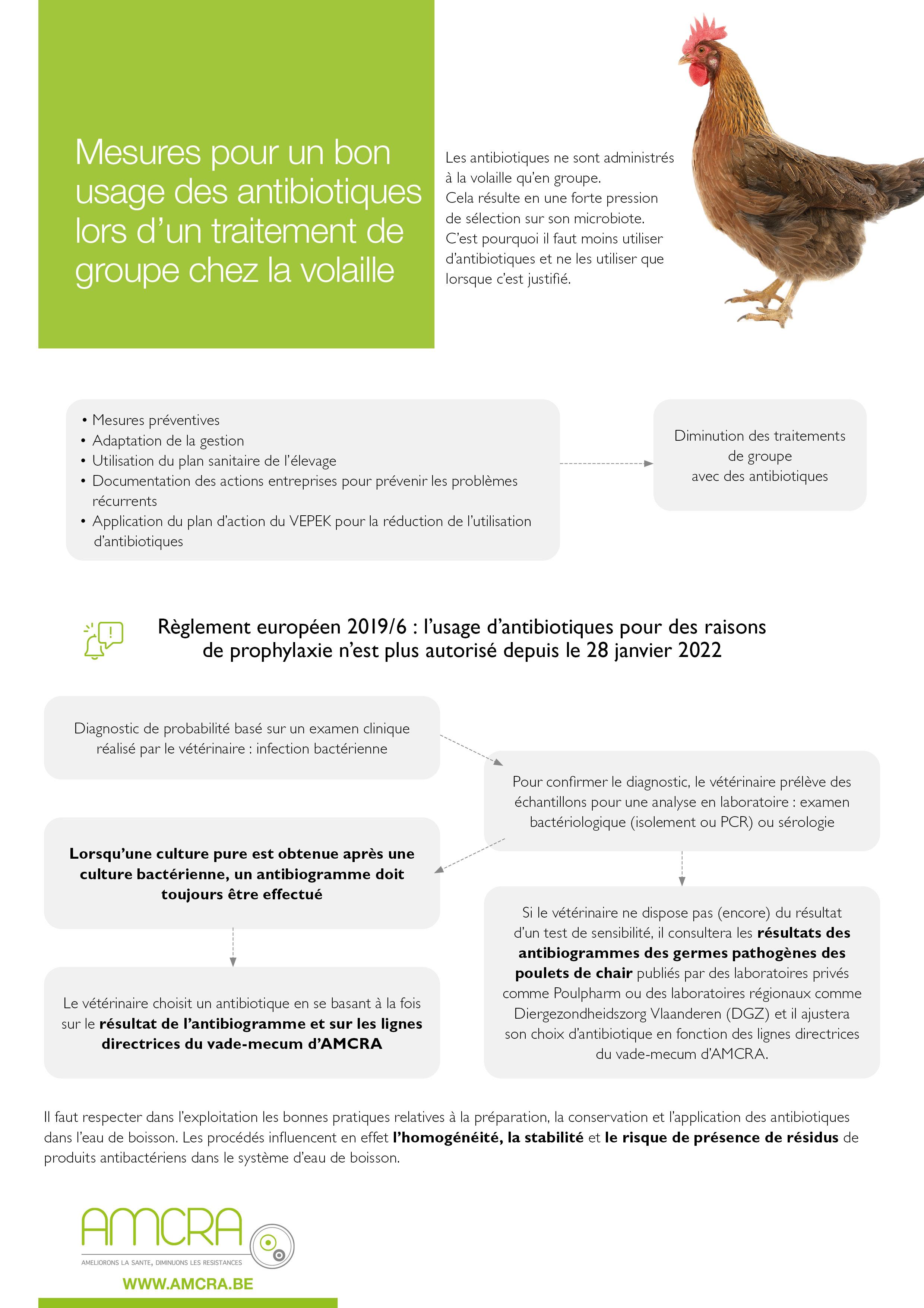 En concertation avec les groupes de travail d’AMCRA, un guide du bon usage des antibiotiques a été développé pour chaque groupe animal (porcs, volailles, bovins). Ces guides comportent des recommandations générales à propos du bon usage des antibiotiques et ils s’adressent tant aux éleveurs qu’aux vétérinaires.