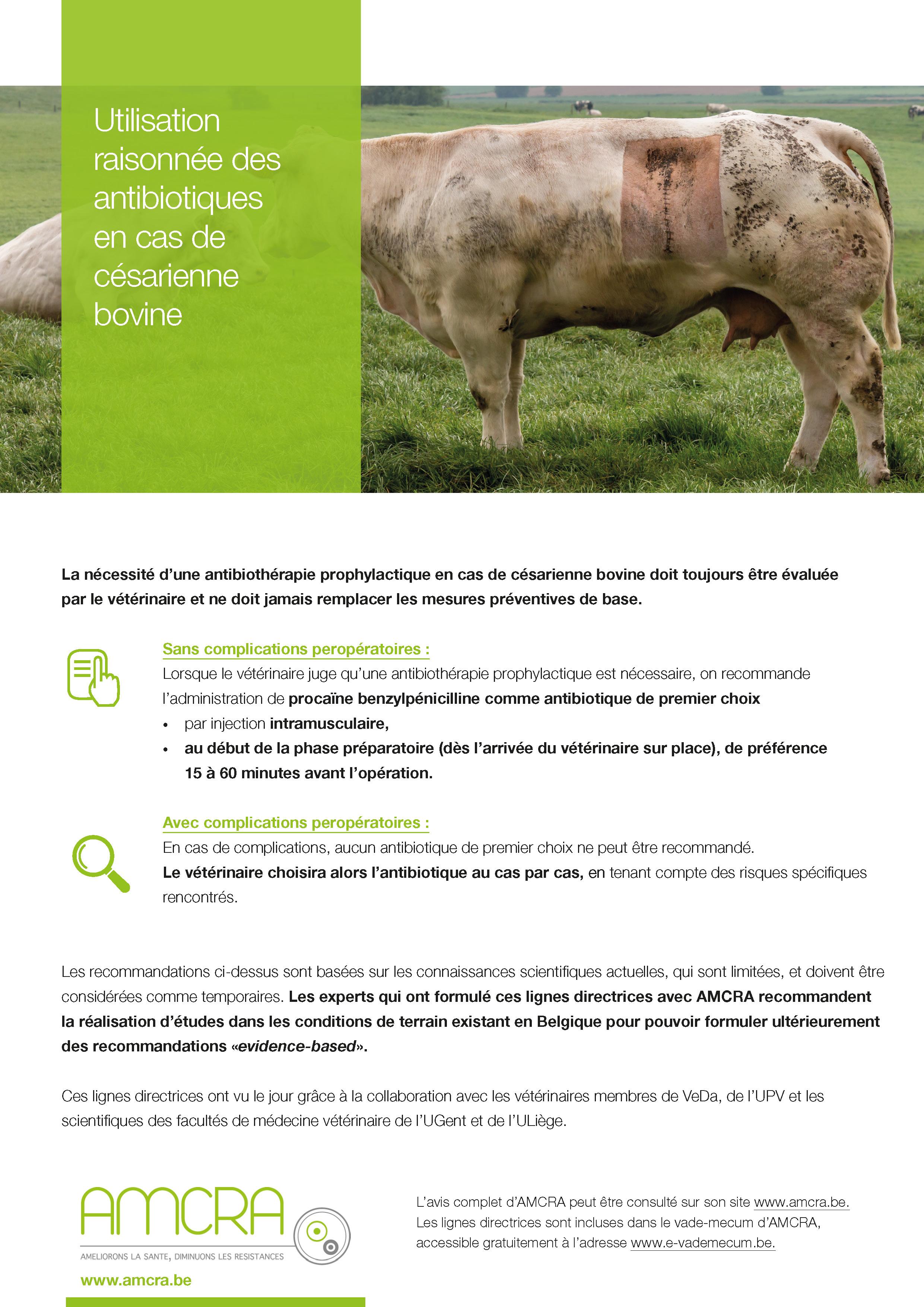 Les recommandations pour l'antibiothérapie en cas de césarienne bovine doivent être considérées comme temporaires et basées sur les preuves scientifiques limitées actuelles. Les experts de ce groupe de travail recommandent la réalisation d’études dans les conditions de terrain en Belgique pour pouvoir formuler ultérieurement des recommandations « evidence-based ».