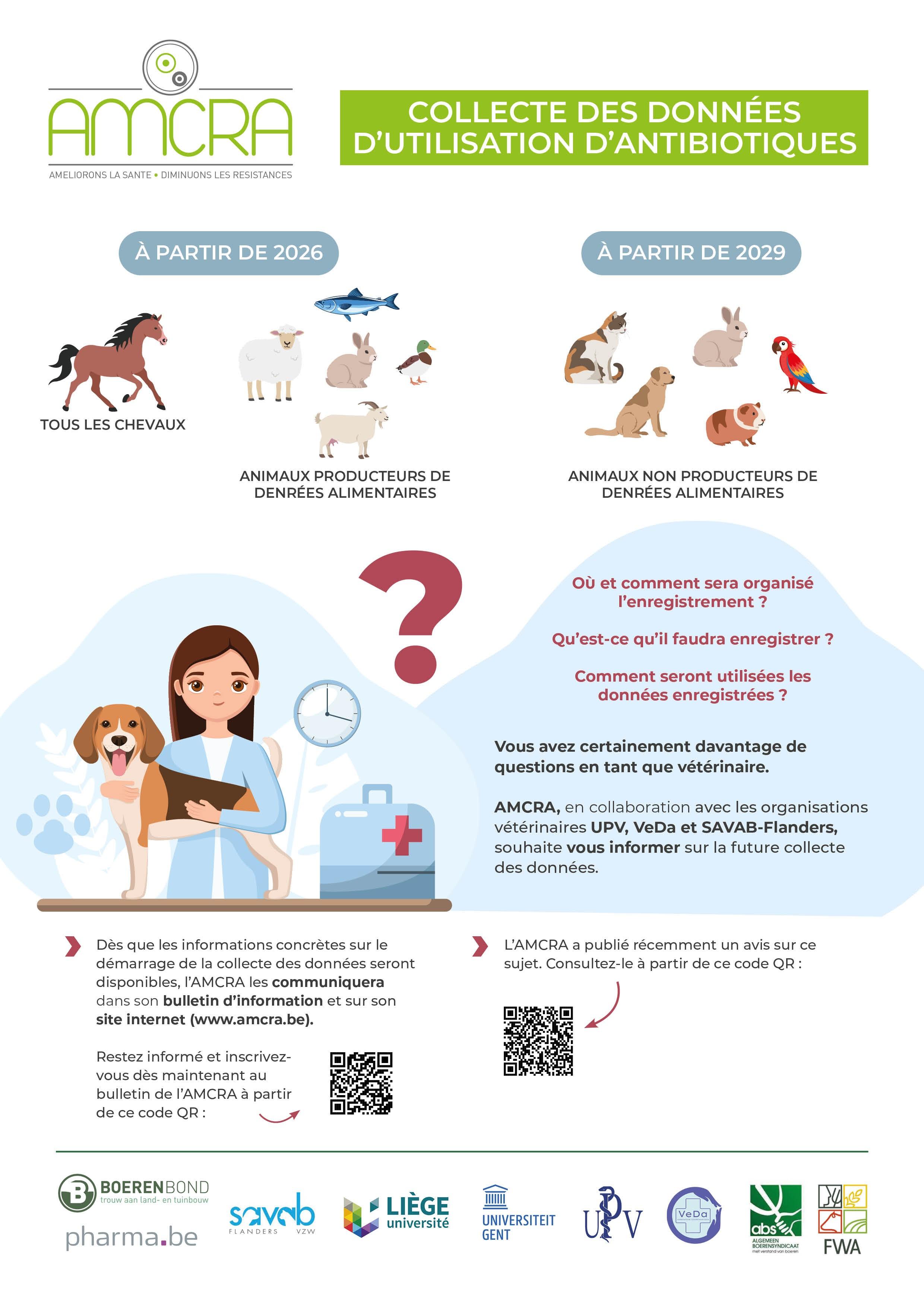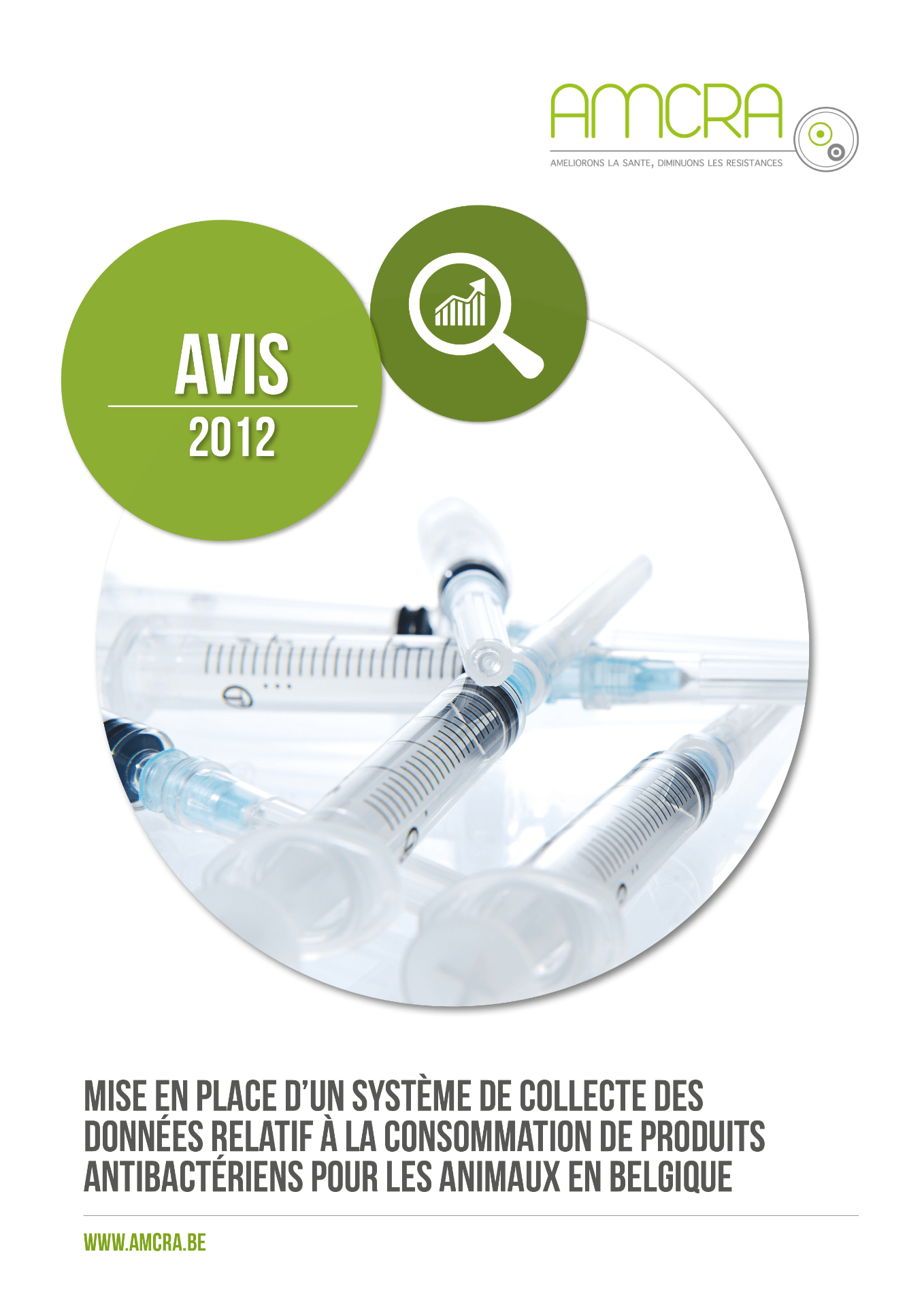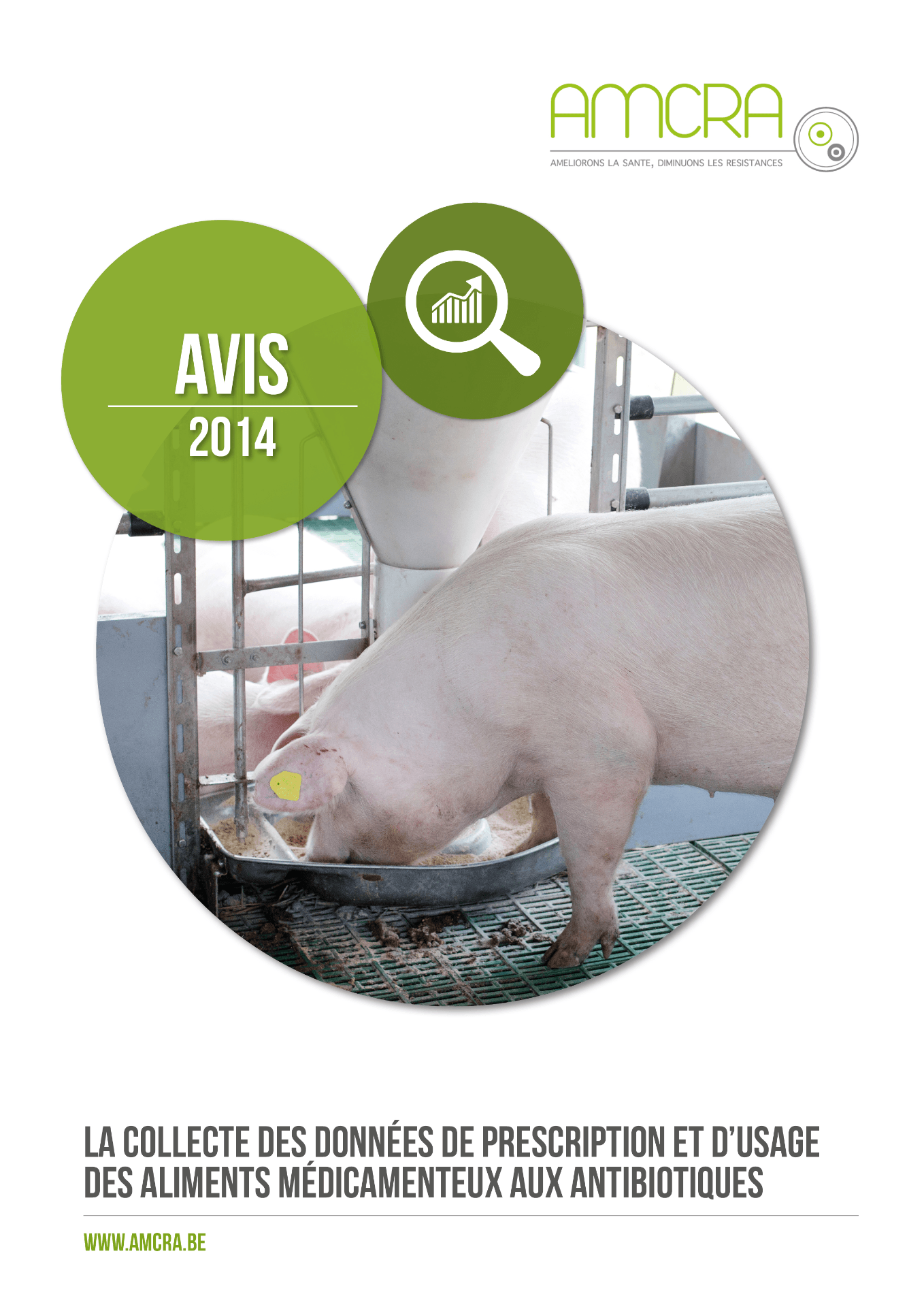 L’avis « Collecte des données » a été formulé par le groupe de travail Collecte des données et mis à la disposition des autorités à partir de septembre 2012. Sa mission consistait à rédiger un rapport d’étude sur les possibilités d’extension des systèmes actuels de collecte des données en vue de répertorier l’usage des antibiotiques en médecine vétérinaire et d’obtenir une banque de données électronique. Cet avis a servi de fil rouge pour la création des systèmes de collecte des données actuels par les secteurs privé (Registre AB et Bigame) et public (Sanitel-Med) en Belgique. Par ailleurs, en 2013, AMCRA s’est fixé pour objectif de formuler des propositions concernant l’élargissement des chapitres III « Prescription des aliments médicamenteux » et V « Usage des aliments médicamenteux » de l’AR du 21 décembre 2006. L’élargissement de ces chapitres III et V visait la collecte électronique centralisée des données des prescriptions d’aliments médicamenteux.