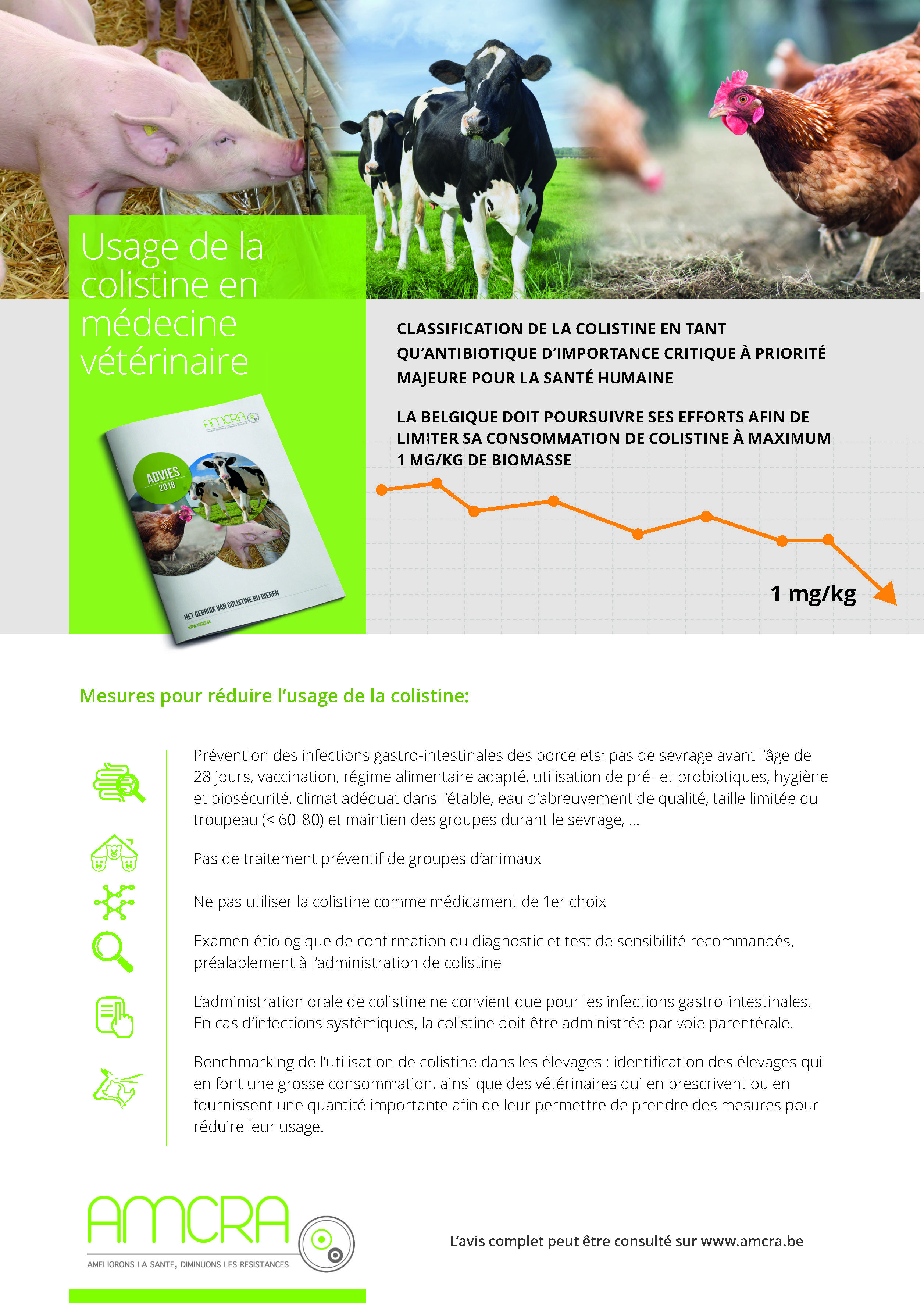 Le code de couleur rouge n’est pas attribué aux polymyxines, mais des mesures supplémentaires doivent être prises pour que leur utilisation en médecine vétérinaire continue à baisser et ne dépasse plus 1 mg par kg de biomasse.