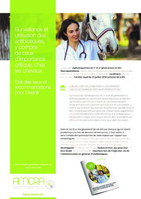 C’est pourquoi AMCRA a formulé dans son avis sur l’utilisation et le suivi de l’usage d’antibiotiques chez les chevaux, y compris des antibiotiques d’importance critique, des recommandations destinées à garantir la santé et le bien-être des chevaux dans le cas de l’élargissement de l’AR du 21 juillet 2016 à cette espèce.