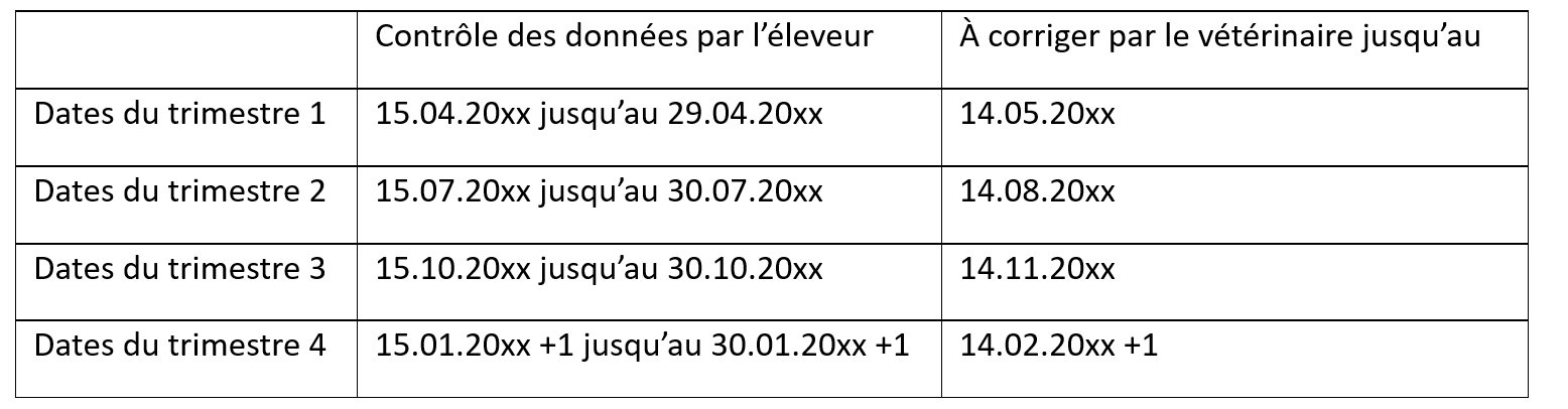 Le tableau ci-dessous présente un aperçu du temps dont dispose l’éleveur pour vérifier les données par trimestre, où « xx » doit être remplacé par l’année concernée.