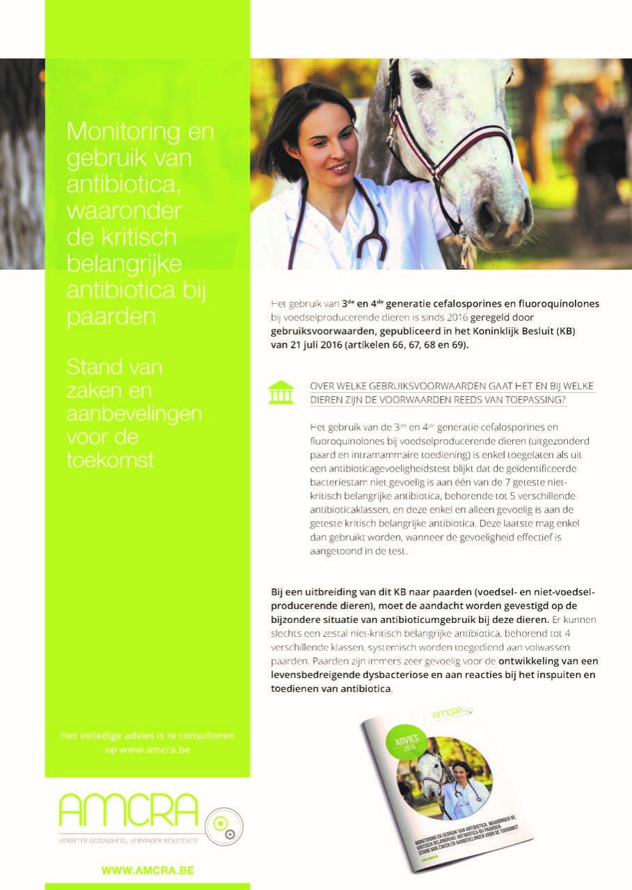 Het gebruik van 3de en 4de generatie cefalosporines en fluoroquinolones bij voedselproducerende dieren is sinds 2016 geregeld door gebruiksvoorwaarden, gepubliceerd in het Koninklijk Besluit (KB) van 21 juli 2016 (artikelen 66, 67, 68 en 69). Bij een uitbreiding van dit KB naar paarden (voedsel- en niet-voedselproducerende dieren), moet de aandacht worden gevestigd op de bijzondere situatie van antibioticumgebruik bij deze dieren. AMCRA heeft daarom in haar advies omtrent de monitoring en gebruik van antibiotica, waaronder de kritisch belangrijke antibiotica bij paarden, aanbevelingen geformuleerd die bij een uitbreiding van het KB van 21 juli 2016 naar paarden, de gezondheid en het welzijn van deze dieren moeten garanderen.