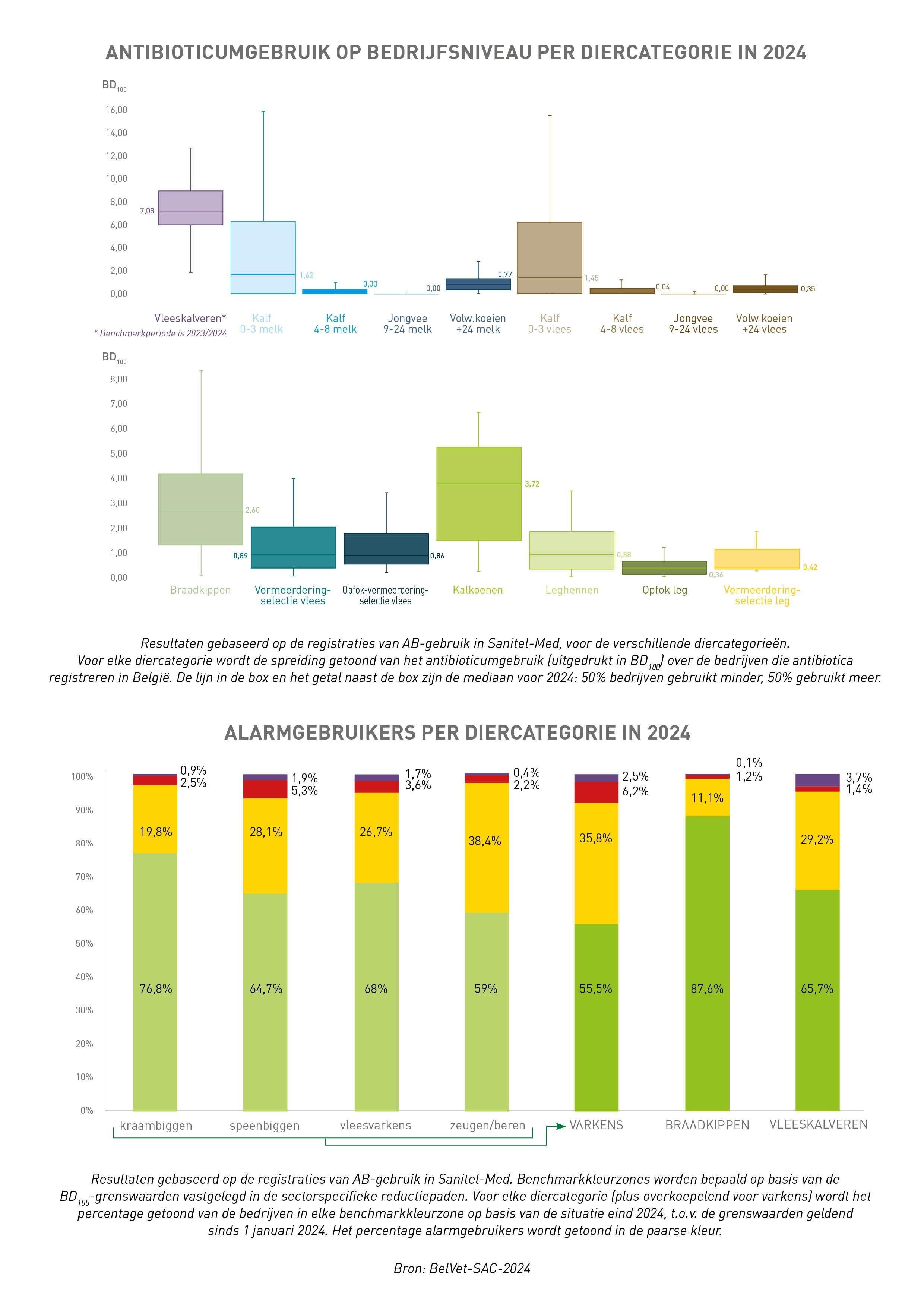 In de Barometer worden de gebruiksresultaten ook in het kader van de ‘reductiepaden’ (=grenswaarden voor het aantal behandeldagen op 100, ofte BD100, op bedrijfsniveau) opgevolgd voor de varkens-, vleeskippen- en vleeskalverensector.