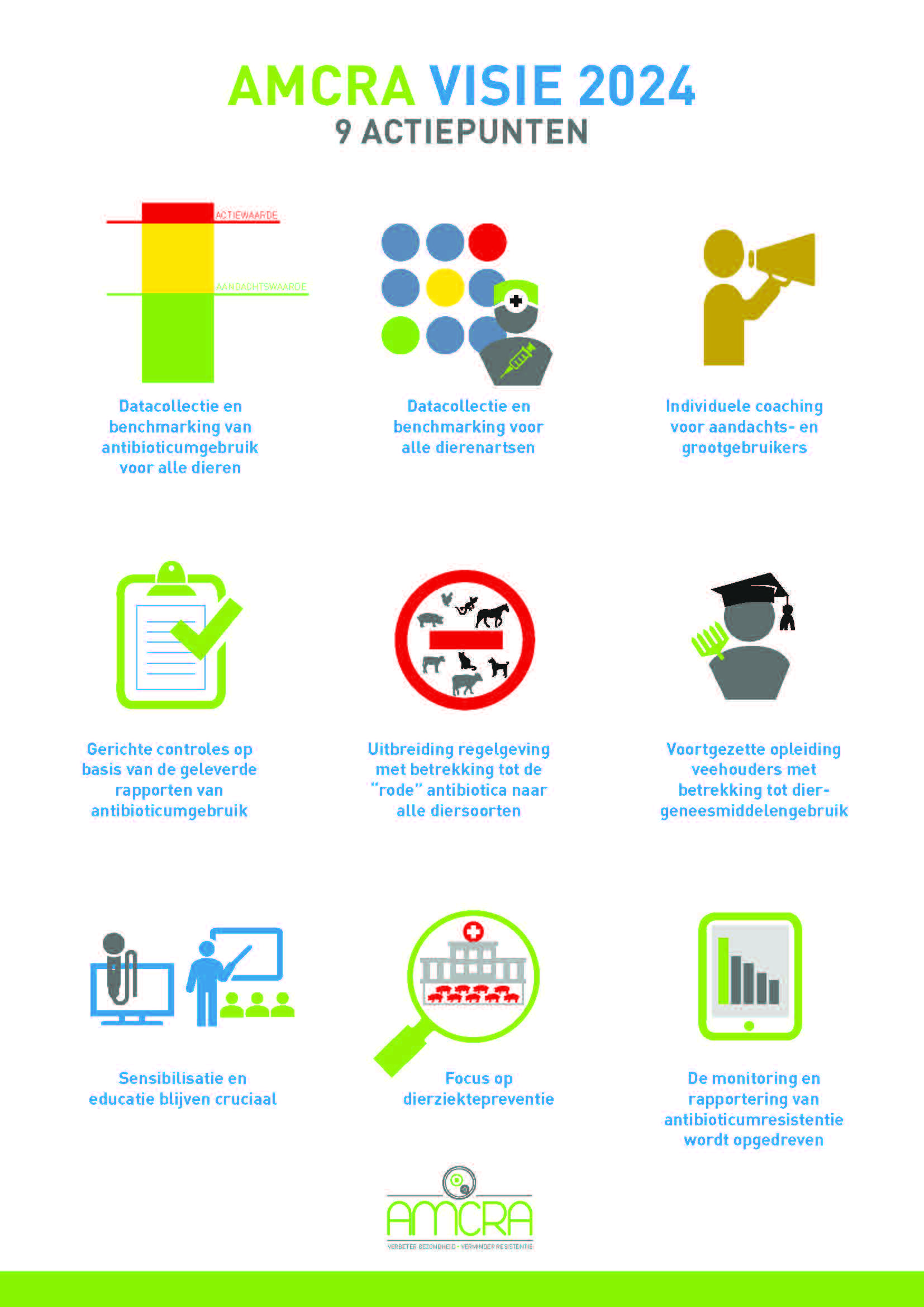 Op dit moment wordt het antibioticumgebruik op bedrijfsniveau reeds verzameld voor alle bedrijven waar varkens, pluimvee en vleeskalveren worden geproduceerd en op de meerderheid van de melkveebedrijven. Het doel is om dit systeem verder uit te breiden zodat tegen uiterlijk 2022 alle voedselproducerende dieren in een wettelijk verplicht systeem zijn opgenomen. Daarnaast moet een systeem opgezet worden om ook het antibioticumgebruik bij gezelschapsdieren te monitoren via de dierenarts. Dit systeem moet uiterlijk 2024 operationeel zijn. Voor de bedrijfsdierenartsen moet een ondersteuning voorzien worden voor het administratieve werk verricht in kader van de antibioticumgebruik datacollectie.